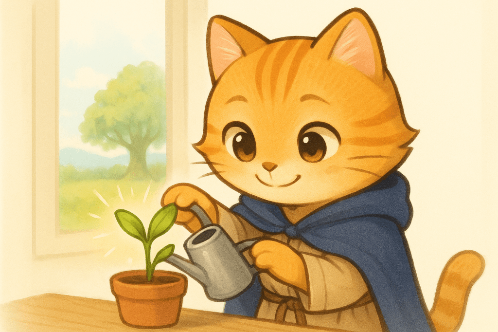 米爾貓提起水壺,澆著水。